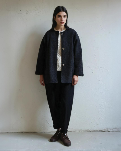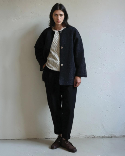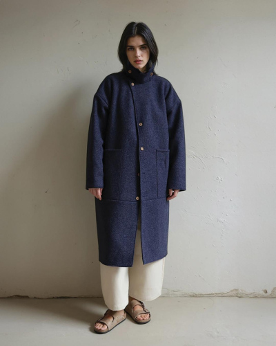 100% boiled wool coat. 100% raw cotton lining. Mother of pearl buttons closure. Featuring two large front pockets. Timeless elegance for perfection. Made in Spain