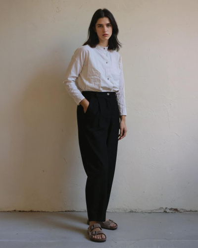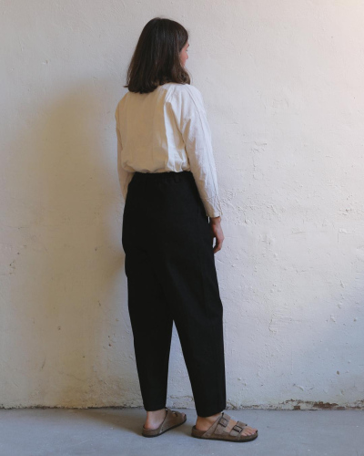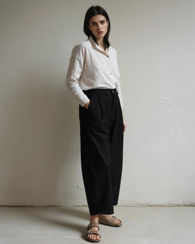 A casual pant made from 100% denim cotton 10 oz. Features two front pockets, pleats, front button closure and belt loops. Elasticated waistband in the back. Made in Spain