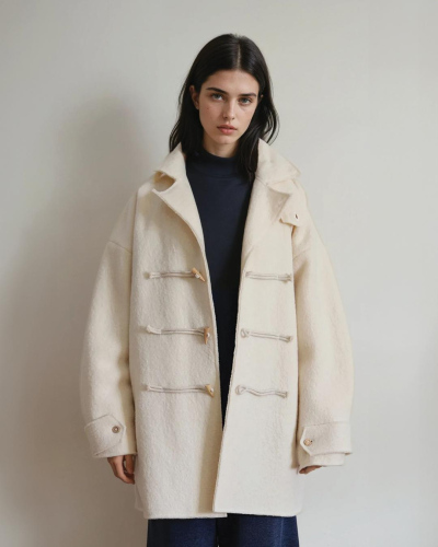 Classic double-layered duffle coat made from 100% boiled wool. Front opening with wooden button and cotton cord closure. Two front side pockets. Classic elegance with a contemporary design and raw edges. A versatile piece, perfect for any occasion. Made in Spain