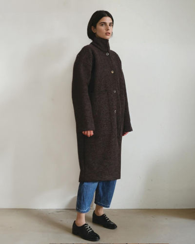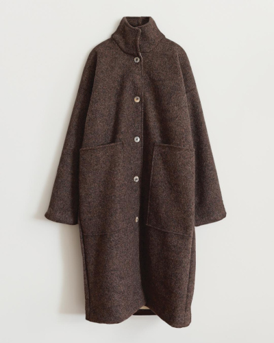 Timeless double-layered long coat made from 100% boiled wool. Front opening with wooden button closure. Two front pockets. Classic elegance with a contemporary design and raw edges. Featuring neck closure for adjustment. Made in Spain