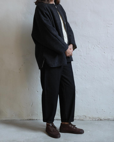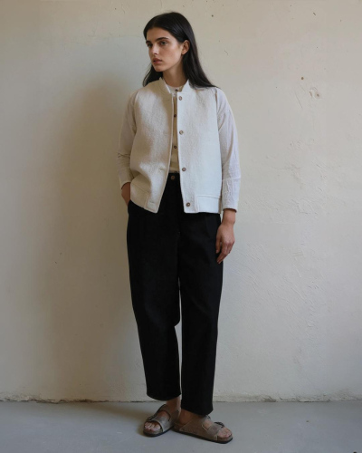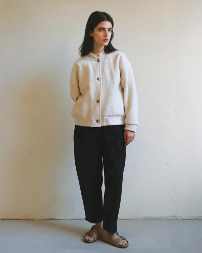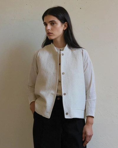 100% boiled wool bomber with 100% raw cotton lining. Mother of pearl buttons closure. Featuring two side pockets. Classic design perfect for every occasion. Made in Spain